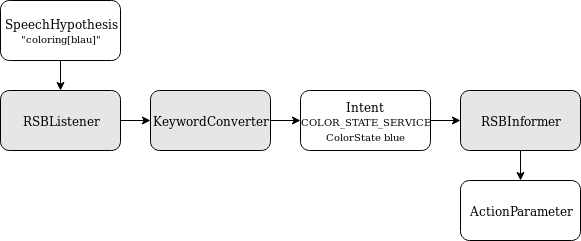 The component receives speech not as raw audio data but Speech Hypotheses objects, meaning its RSB connection “listens” for such events. Whenever a Speech Hypotheses event is detected, the component converts it to a corresponding ActionParameter. The keyword converter class is used to convert Speech Hypotheses objects into their respective intent (if existing). An intent refers to a state service and its value, such as the color state service with value ‘blue’, or the power state service with value ‘off’. The necessary information is saved in the grammar tree with the syntax state_type[value] (e.g coloring[blau]).